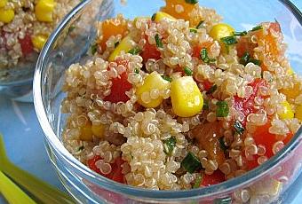Dans un saladier mélanger le quinoa avec les poivrons pelés taillés en dés et le maïs. Arroser d'huile et de vinaigre. Saler et poivrer.