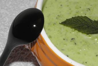 2. Dans un blender, mettre les petits pois, le lait, le yaourt, la crème fraîche, une pincée de sel et de poivre. Ajouter les feuilles de menthe coupées.
