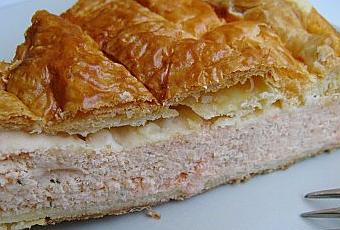 Foncer le moule avec une pâte feuilletée, répartir la préparation au saumon puis recouvrir avec la deuxième pâte en soudant bien les bords.