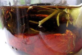 Couper les tomates en quartiers et les déposer sur une plaque recouverte de papier sulfurisé. Saupoudrez de sucre, de sel, de romarin et thym, d'huile d'olive, et passer quatre heures au four à 90°C. Laisser refroidir, et mettre dans des bocaux les tomates recouvertes d'huile d'olive, et de morceaux d'ail.