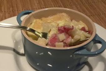 Ajouter le beurre, le jambon et l'oignon. Puis, recouvrir de Reblochon.