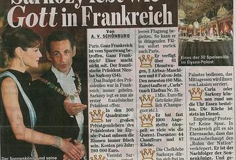 Je ne reviens pas bredouille d’une visite fort matutinale chez Sarkofrance… Bilan de la semaine – la 124è – Le retour de l’omniprésident, et alors ? déjà intéressant, mais est-ce bien utile de le préciser ? J’ai déniché une pépite dans les commentaires : la traduction d’un article du journal allemand Bild Zeitung, sur le train de vie de Nicolas Sarkozy et Carla Bruni à l’Elysée, sous la plume d’ A.V. Schönburg… Les lecteurs allemands, autrement plus informés que nous – même au plus fort de la polé-mique sur le budget de l’Elysée – ne risquent pas de nous envier notre Chef d’Etat ! Je vous laisse juge :