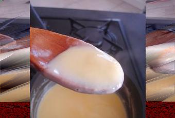 battre les oeufs et le sucre, ajouter le lait (en principe chaud mais là on la mis froid ca a marché), mettre sur feu doux jusqu'à ce que la cuillère en bois que vous utilisez pour remuer soit nappée