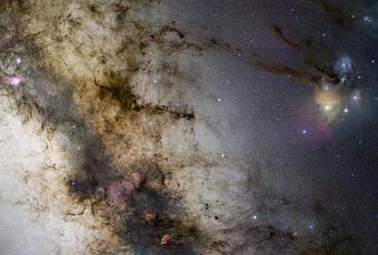 Cette image composite obtenue est une grande fenêtre ouverte sur la partie centrale de notre galaxie. Nous sommes dans la direction des constellations du Sagittaire et du Scorpion. C’est d’ailleurs au sein de cette dernière que l’on peut voir la rougeoyante étoile Antarès, en haut à droite de l’image, cottoyant l’ensemble Rho Ophiuchi, très coloré et nimbé de gaz. Toujours dans cette direction mais beaucoup plus loin derrière – pourtant bien visible – l’amas globulaire Messier 4, riche conglomérat de centaines de milliers d’étoiles situé aux abords de notre grande galaxie …