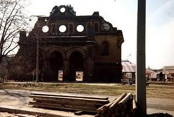 Derrière cette façade, un cirque avait monté un chapiteau. La façade existe toujours mais le cirque a depuis longtemps repris la route.