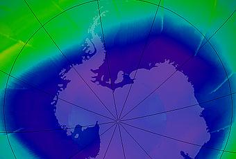 L’ozone – ou O3, un gaz composé de trois atomes d’oxygène – forme une couche dans l’atmosphère, à environ 35 kilomètres d’altitude. Cette couche nous protège des rayons ultra violets (UV) du soleil. Les UV sont des rayons très énergétiques qui peuvent, entre autres, provoquer des cancers de la peau. La couche d’ozone a été altérée par endroits à cause des gaz dits CFC (chlorofluorocarbures ). On les trouvait en grande quantité dans les aérosols.