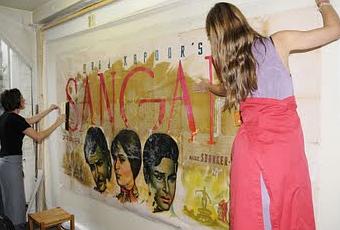 Jeudi dernier, aux Ateliers Saint-Martin à Paris, nous avons assisté à une phase de l'entoilage de l'affiche géante de Sangam, qui fera partie de l'exposition Raj Kapoor. Julie (au fond) et Karine déposent l'affiche, qui adhère à une feuille plastique qui sert à la transporter sans l'endommager, sur une toile de lin encollée peu avant. L'opération s'est déroulée rapidement, avec une grande dextérité, et à aucun moment nous n'avons douté de leur compétence. Un beau travail de pros.