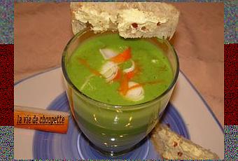 Versez le velouté réfrigéré en verres, garnissez de surimi et de zestes.