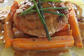 Eplucher les carottes et les couper en bâtonnets, les faire cuire dans une casserole contenant une grosse noix de beurre fondu et un peu d'eau en les remuant pour bien les enrober de jus, la cuisson doit être "al dente". Réserver au chaud.