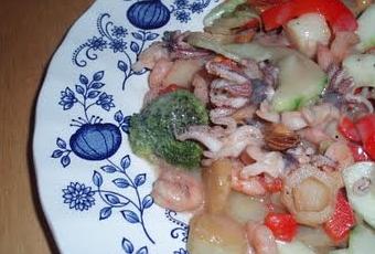 Salade de légumes et fruits de mer déglacés au jus de raisin 400g de fruits de mer (pétoncle, moule, crevette, seiche)1 concombre
