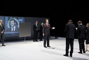 Ce que le spectateur avait lu jour après jour dans les journaux, David Hare en a fit une tragédie finement ficelée, aussi énergique que didactique. Les protagonistes, des comédiens qui ont adopté la figure et la gestuelle des politiques qu’ils incarnent, décident du sort du monde autour de quelques repas bien arrosés, s’engueulent en vieux copains et provoquent Européens ou Américains, en tous cas Arabes, par caméras interposées. Dans leurs ballets, point de désert, ni d’Irakiens, encore moins d’Armes de Destructions Massives, seulement des positions politiques ou professionnelles à maintenir, des électeurs à gagner, des cauchemars personnels ou des nécessités de se représenter.