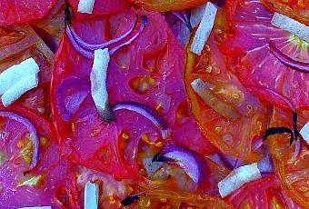 Pour la garniture :Des tomates de couleurs variées1 oignon rougeDes copeaux de fromage de chèvre très sec1 filet d'huile d'olive