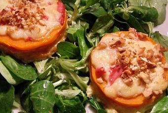 - superposé butternut, comté, bacon, butternut, comté, bacon, butternut, comté (les chutes), bacon (chutes aussi) et morceaux de noix.