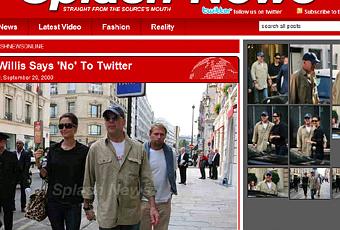 Artistes :Bruce Willis est actuellement à Paris pour la promo de Clones (Surogates). A un journaliste qui lui a demandé s'il allait se mettre sur Twitter comme son ex Demi Moore et Ashton Kutcher, Mr Die Hard a répondu : "J'en doute, j'en doute. Je ne peux pas déjà pas me supporter alors si je commençais à twitter... Je pense que c'est de la folie". En V.O., ça donne : "Doubtful, doubtful. I just can't live with myself if I started Twittering... I just think that way lies madness." Soit 114 signes. Hé Bruce, tu as tout bon !Pas Twitter donc mais l'acteur a pourtant créé le buzz sur internet lors de la sortie de Die Hard 4. Allez, il y viendra un jour.
