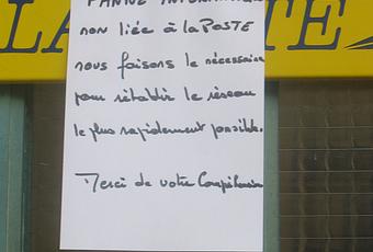 Aujourd’hui jeudi 1° octobre 09, le problème continue à la Poste. Les opérations liées à l’informatique sont suspendues.Les clients de la Poste sont bien patients ! Le premier article du Toupin sur ce sujet date du 24 septembre 09 et cela faisait plusieurs jours déjà que les clients de la Poste ne pouvaient faire leurs opérations….Nul doute que dans un grand bureau de poste la réparation n’aurait pas tardé!