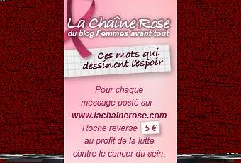 Pendant le mois d'octobre, pour chaque message posté sur le site www.lachainerose.com à une femme en particulier, ou aux femmes atteintes de cancer du sein, 5 euros seront versés par Roche à « Cancer du Sein, Parlons-en », le CEW et Europa Donna, impliquées au quotidien dans la prévention, la lutte contre le cancer du sein et l'amélioration de la qualité de vie des personnes concernées.