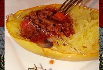 Pour finir, gratter les moitiés de courge avec la fourchette et verser la sauce bolognaise sur le dessus, servir aussitôt.