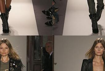Pantalon en cuir, veste d’officier avec les décorations officielles, mini short en cuir destroy, veste épaulé (mais moins que la dernière collection quand même) , tee shirt au décolleté profond en lamé doré, carrure ‘gladiator’ de rigueur, boots à lacets et sans clous cette fois.