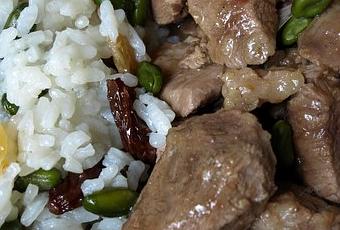 Cuire le riz à l'eau salée selon la méthode habituelle. En fin de cuisson, lui ajouter les raisins et les pistaches, remuer doucement et servir à côté de la viande.