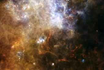 Tout ce que l’on peut voir sur l’image ci-dessus, apparait d’ordinaire sombre, noir, opaque. Des milliards de poussières infimes, éparpillées dans la Voie Lactée. Les caméras du télescope spatial Herschel (Spectral and Photometric Imaging REceiver et Photoconductor Array Camera and Spectrometer) offrent un aperçu – très rare – de ces structure qui, peu à peu, formeront des étoiles. Exposées à un froid intense, presque le zéro absolu, des filaments de matière émergent. Observés dans l’infrarouge submillimétrique, on peut voir en rouge les particules les plus froides et en bleu celles qui sont un petit peu moins froides. Nous sommes à la genèse des grands nuages moléculaires. Notre galaxie regorge de zones analogues et montre une fécondité importante.