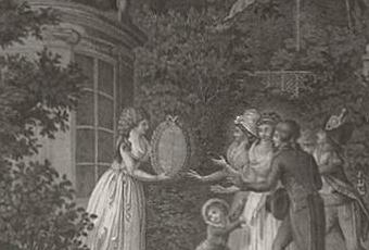 « Les Douceurs de la fraternité. » « Français, unissons-nous… qu’une saine harmonie fixe la liberté, sous le règne des Lois ! Les hommes sont égaux : tous ont les mêmes droits ; périsse l’égoïsme ; et vive la Patrie ! » « A Paris chez Bance rue St Severin N°115 [ou 25]. » Par Gautier (peut-être Jean-Rodolphe Gautier : 1764-1820) d’après un dessin de Vangorp (Henri Nicolas Van Gorp : vers 1756 - après 1819). Une femme se tenant sur le parvis du « Temple de la Liberté » tend les « Droits de l’Homme et du Citoyen » à un groupe de femmes et d’hommes. Le drapeau de la « Constitution Française », surmonté d’un bonnet phrygien, flotte derrière. Au dessous, dans une couronne de branches de laurier et de chêne, la République se repose sur la « Loi constitutionnelle » elle-même posée sur un autel. Des putti tendent les mains vers elle. La gravure est d’époque, dans un cadre du XIXe siècle. Voir le site : http://richard.lemenn.free.fr