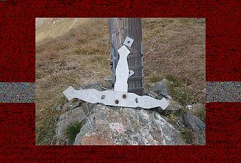 "Ce dimanche matin 27 septembre, je m'engage sur le chemin de Loèche sans but précis. Après 30 minutes de marche à l'entrée de la grande clairière, je décide de "tirer" droit en haut en direction du Gitzitotz 2495m, ou du Tone de Varone qui est connu pour la croix en bois que l'on voit de partout dans la région. Cinq cents mètres de dénivelé dans l'herbe et la caillasse: Balthus, mon chien, donne le rythme, mais c'est moi qui suis à quartes pattes.... Arrivé à 150 mètres sous le sommet dans un couloir ou seul les chamois s`aventurent, mes yeux sont attirés par une forme bizarre." Notre marcheur continue son effort, la curiosité aiguisée. Il s'approche de l'objet étrange.