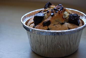 * Remplissez vos moules aux trois quarts, décorez avec les pépites mises de côté puis enfournez à 200 °C pendant 25 minutes. Les muffins doivent être dorés sur le dessus.
