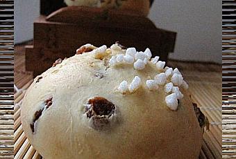 (temps de préparation : 1h10 de MAP / 5 min de pétrissage et d'inclusion des raisins et pépites / temps de repos : 45 min / temps de cuisson : 20 min)