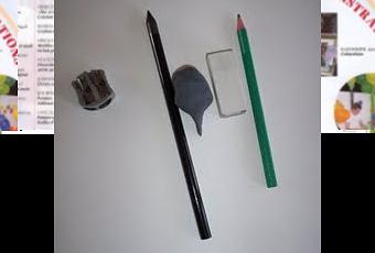 Un taille crayon, mine de plomb(2 utilisées pour ce portrait, 2B et 9B), une gomme à fusain(gomme mie de pain), une gomme classique et un crayon HB