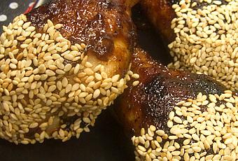Laisser tiédir quelques minutes puis tremper les extrémités charnues des pilons dans les graines de sésames grillées et servir aussitôt.