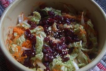 Mélanger les carottes, le chou chinois, la sauce et les cranberries. Parsemer de graines de sésame.