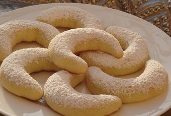 Former des lunes, de petite taille car elles gonflent , mettez les sur une plaque couverte de papier sulfurisé, et enfourner dans un four préchauffé a 160 degrés pendant 10 a 12 minutes.