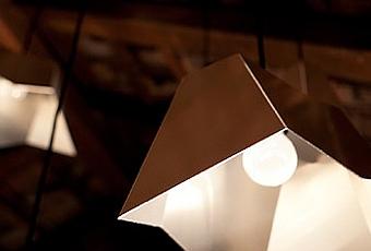 Similaires et différentes à la fois, suspendues au plafond, ces lampes aux abat-jours anguleux et crénelés prennent des airs de chauve-souris métallisées. Réalisées en fine tôle d’aluminium pliée, elles sont actuellement en cours de production.