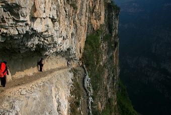 Certains enfants en Chine pour atteindre l'école doit suivre un itinéraire le long d'une route extrêmement dangereuse à proximité du village de Gulucan dans le comté de Hanyuan, Sichuan province.