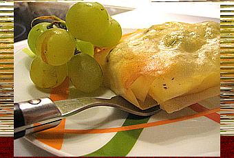 centre de chaque feuille un demi picodon coupé à l’horizontal, disposer 5 grains de raisin, poivrer et plier chaque feuille tel un feuilleté.