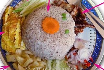 Le Khao kluk kapi est une spécialité Thaï composée d'un riz sauté à la pâte de crevettes, de fines lanières de porc caramélisé et d'accompagnements divers. Ingrédients pour 4 personnes