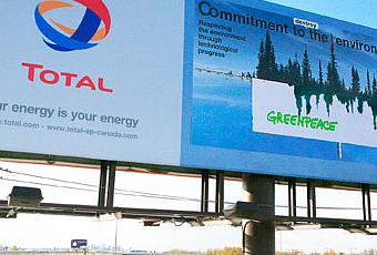 Au moment où les activistes de Greenpeace s’apprêtaient à passer une partie de la nuit sur les cheminées de la raffinerie Total du Havre, au Canada, dans la ville d’Edmonton (province de l’Alberta), d’autres militants de Greenpeace ont détourné des panneaux publicitaires géants présentant la campagne de communication menée par Total pour verdir son image.