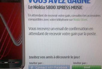 Je reçois cet après midi une invitation à venir jouer à un jeu Nokia. Moi qui n'ai jamais rien gagné de ma vie, je joue. Et INCROYABLE ! Pour la première fois de ma vie, j'AI GAGNE un téléphone Nokia 5800 XPRESS MUSIC ! Aurez-vous autant de chance que moi ?