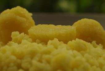 Dans cette recette, le riz en fin de cuisson a un aspect poudreux et obtient cette couleur dorée grâce aux haricots mungo.