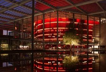 Arrivant l’AT &T Performing Arts Center, le visiteur est accueilli par un large auvent solaire, clé de voûte environnementale du projet créant un espace public ombragé sous l’impitoyable soleil de Dallas. A l’intérieur, derrière la façade vitrée, les espaces publics s’enchaînent assurant une transition douce et guidant le visiteur jusqu’au volume de verre rouge vif de l’auditorium: 2200 places réparties sur 6 étages selon un plan en fer à cheval pour plus de proximité avec la scène. La distance la séparant du balcon est en effet réduite à 26 mètres.