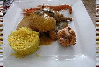 Y a plus qu'à dresser en assiette avec tes langoustines décortiquées, tes langoustines entière et en garniture d'accompagnement, un riz pilaff au safran fera l'affaire.