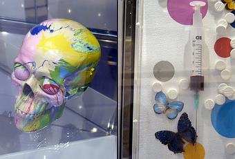La galerie Other criteria, que possède l'artiste, expose des oeuvres plus classiques de l'artiste comme cette sérigraphie de...cranes mais également les cranes peints (qui sont en vente au prix de 35 000 livres) ou encore un mélange des pois dont l'artiste est fan et de médicaments.