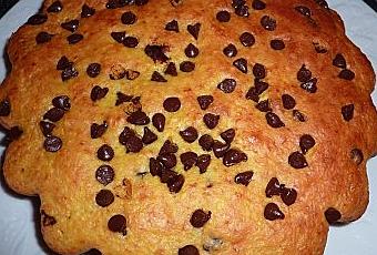 Mélanger la farine et la levure, ajouter le sucre, les oeufs, l'orange mixée et la moitié des pépites de chocolat.