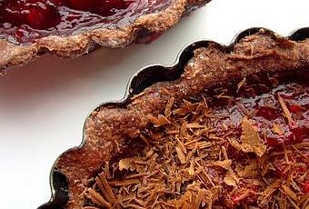 10. Verser la purée de fruit sur le fond de tarte. Parsemer de copeaux de chocolat et faire cuire 20 minutes dans un four préchauffé à 180 degrés. Laisser refroidir et parsemer de copeaux de chocolat noir.