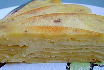 Peler et épépiner les pommes puis les tailler en fines lamelles (idéalement à l'aide d'une mandoline). Les disposer dans un moule à manqué beurré (sauf s'il est en silicone comme ce fut le cas pour moi) en les faisant se chevaucher. Verser la pâte dessus et enfourner pendant 45 min.