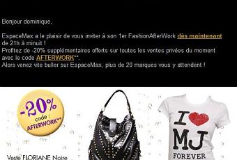 Le site de ventes privées Espacemax.com organise une vente spéciale, baptisée le FashionAfterWork. Originalité de la vente ? Elle se déroule de 21 à minuit et promet une réduction de 20% sur les ventes privées du moment.