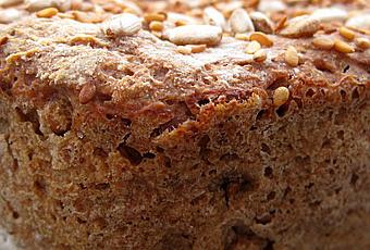 Avant d’enfourner le pain, vous pouvez le saupoudrer de graines de sésame et de tournesol supplémentaires. Tout de suite après avoir enfourné, versez 20 cl d’eau dans la lèchefrite (avec mon moule qui avait absorbé l'humidité, je n'en ai pas eu besoin).