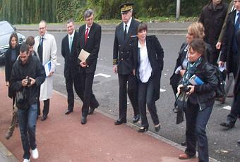 maire-adjointe de Creil et accompagnée par le Préfet à son arrivée à l'IUT où l'attendaient quelques militants du PCF protestant contre la politique du gouvernment.