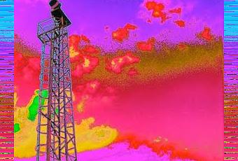 Lutte Contre l'Usure du Quotidien, Réalité Augmentée par Coloriage.Pylône projecteur, ciel rougeoyant, Port du Rhin, Strasbourg.