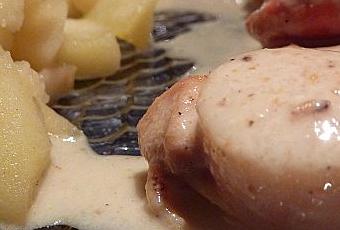 Servir à l'assiette, en répartissant les pommes, 3 noix de Saint Jacques par personne, une bonne cuillère à soupe de sauce. Mettre le reste de sauce dans une saucière et le proposer à table.